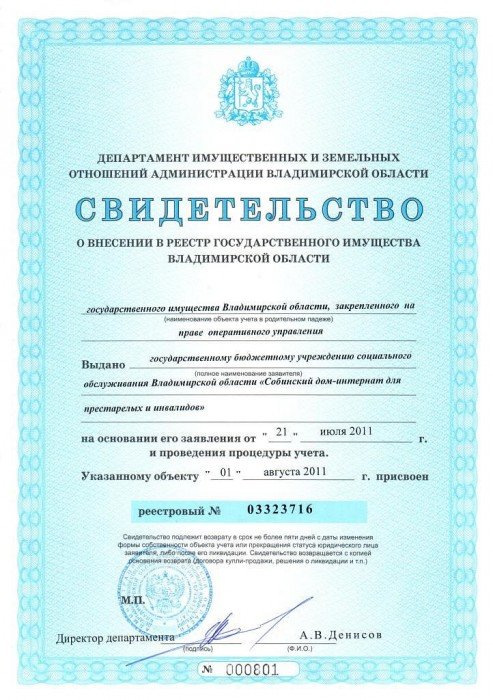 - Свидетельство о внесении в реестр государственного имущества Владимирской области