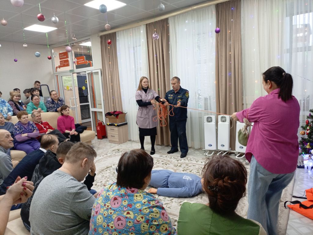 В целях предупреждения несчастных случаев на водоёмах в зимний период спасатель Аварийно-спасательной службы Алиев Г.Г. 25 декабря провел практическое занятие с сотрудниками и проживающими Собинского дома социального обслуживания по оказанию помощи людям, терпящими бедствие на воде, показал какие средства существуют для спасения утопающих и как правильно их использовать.