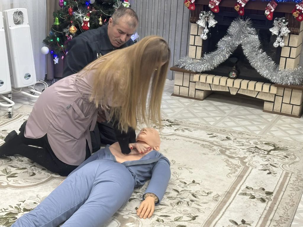 На занятии присутствующие с использованием тренажера для оказания первой медицинской помощи в очередной раз отработали навыки проведения непрямого массажа сердца и искусственной вентиляции легких.