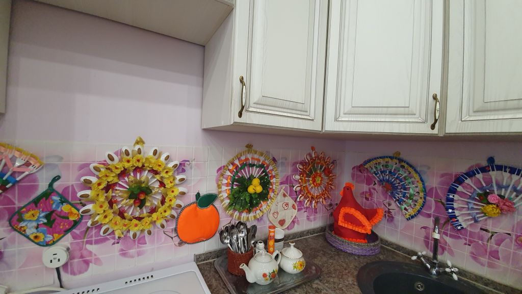 Такая работа словно хранит тепло человеческих рук и передает положительные эмоции и чувства вложенные в нее. Как же сразу преобразилась наша учебная кухня, как заиграла она новыми красками.