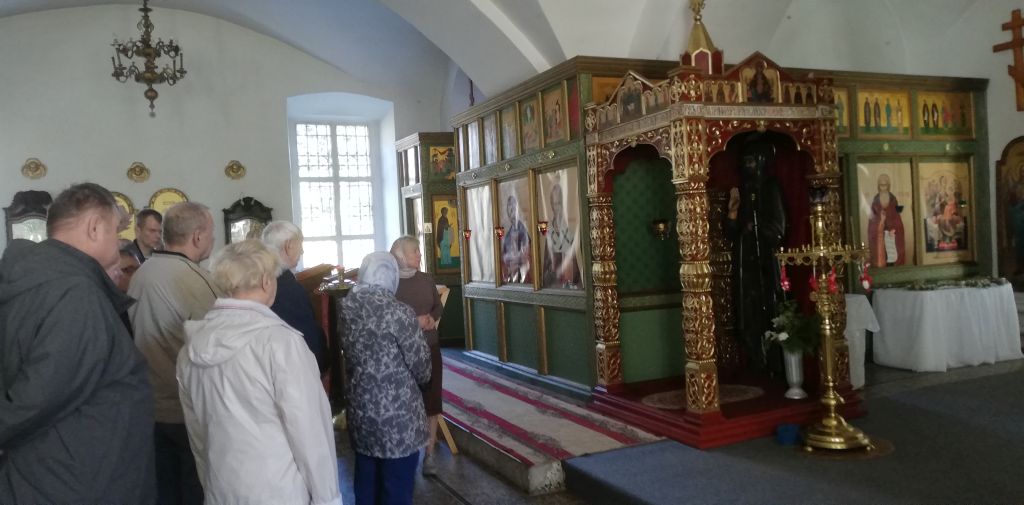 Участники почтили память погибших воинов минутой молчания, зажгли поминальные свечи в Свято-Троицком храме, построенном в 1832 году. Все присутствующие приложились к иконе святого Александра Невского, почитаемой за чудотворную. На ней князь изображен во весь рост в схимническом одеянии. Икона-скульптура выполнена из кипариса по указу Петра Первого. Служители храма рассказали о многочисленных фактах чудесного исцеления верующих данной реликвией.