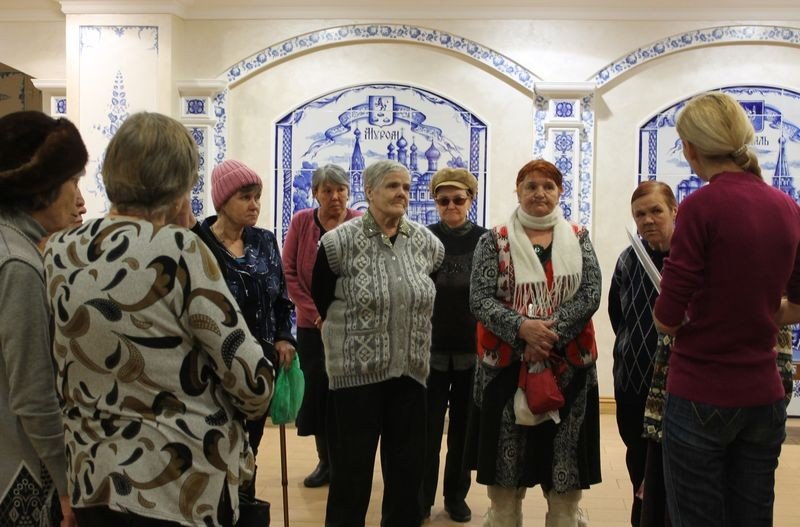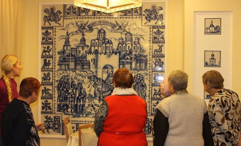 Наши проживающие с интересом разглядывали панно, собранные из множества элементов, особенно понравился сюжет в стиле русской иконописи «Бояре встречают князя Андрея Боголюбского во Владимире».