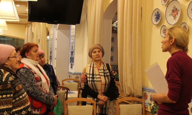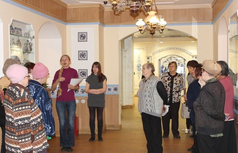 Частью комплекса общественной организации является кафе, оформленное изразцами из гжели. Сначала мы совершили экскурс в историю гжели, узнали о том, как лучшие гжельские умельцы трудились над интерьером кафе.