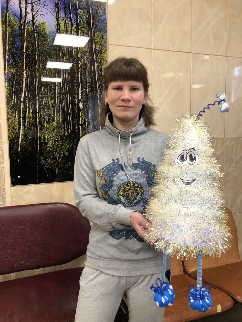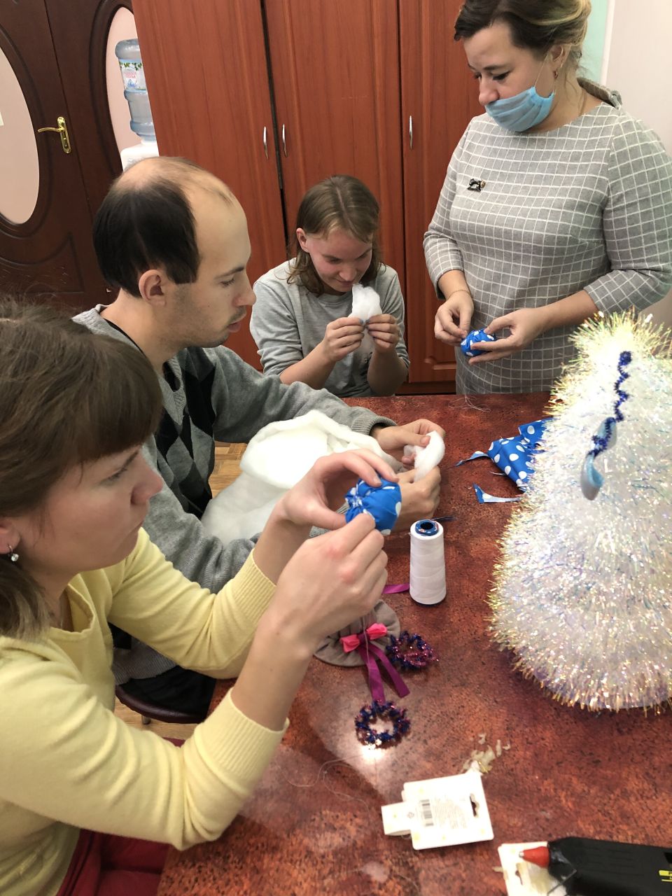 В Собинском ПНИ проводятся мастер-классы по изготовлению новогодней ёлочки из мишуры. Небольшие размеры поделки позволят поставить её на самое видное место.