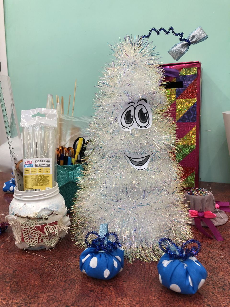 Интересные новогодние ёлки из мишуры сделать не очень сложно. С поставленной задачей ребятам помогает справиться воспитатель-мастерица Иванова А.В., нужно лишь подготовить необходимый материал и немного поспособствовать творчеству.