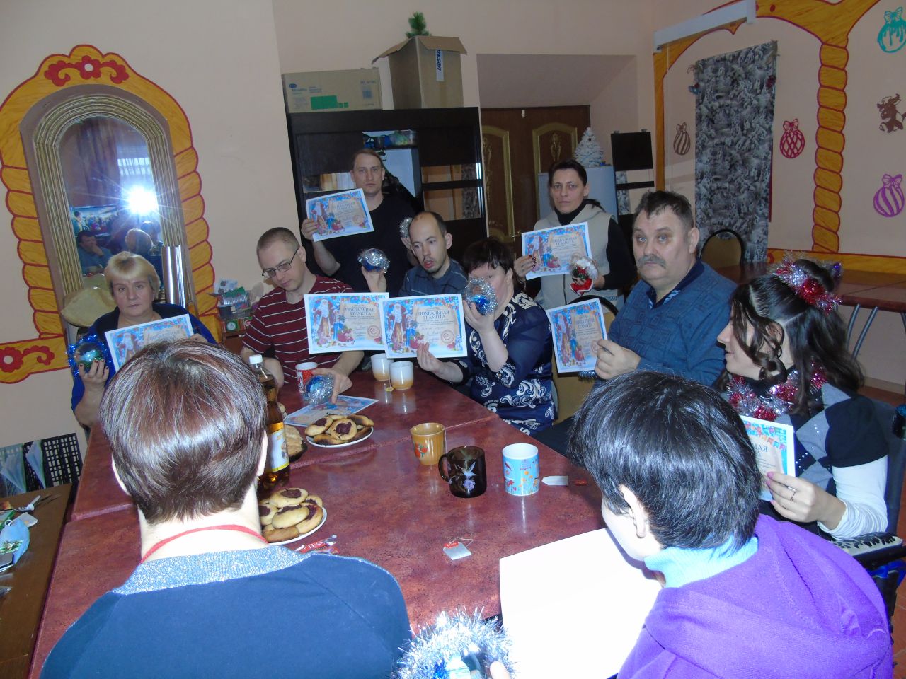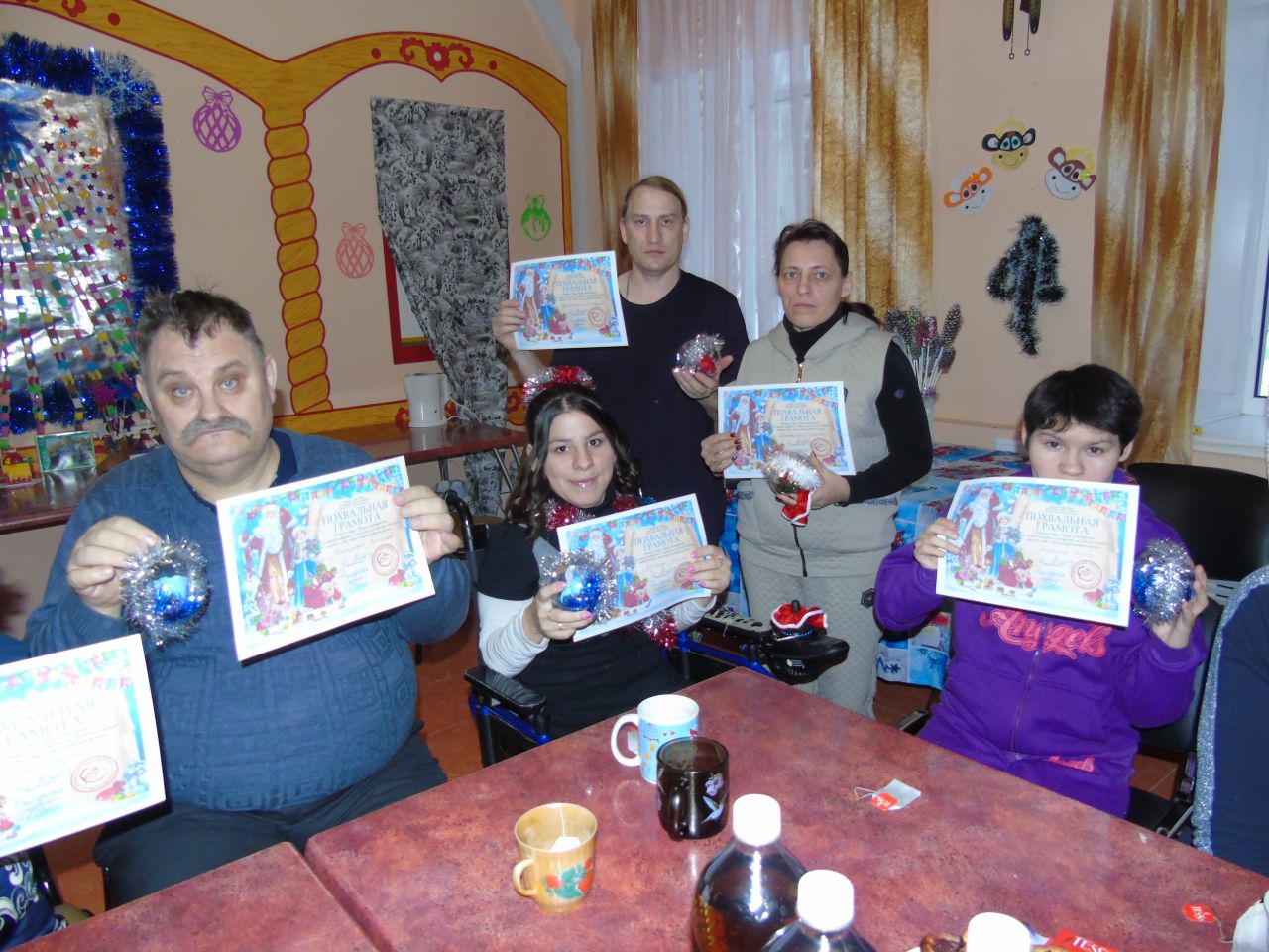 Сегодня в Собинском ПНИ в кружке «ОЧумелые ручки» состоялось последнее занятие на котором были подведены итоги года. Вспомнили какие поделки были сделаны. Каких добились результатов. Всем участникам кружка были вручены грамоты и памятные подарки. По окончанию состоялось чаепитие.