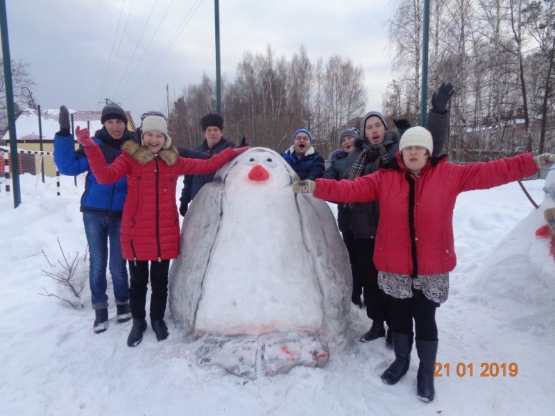 Рекорд по скатыванию самого большого снежка, занесённый в книгу рекордов Гиннеса, принадлежит белорусам. Их снежный ком имел 6,84 метра в диаметре. Наши снежки, конечно же, поменьше, но зато из них получился отличный пингвин.