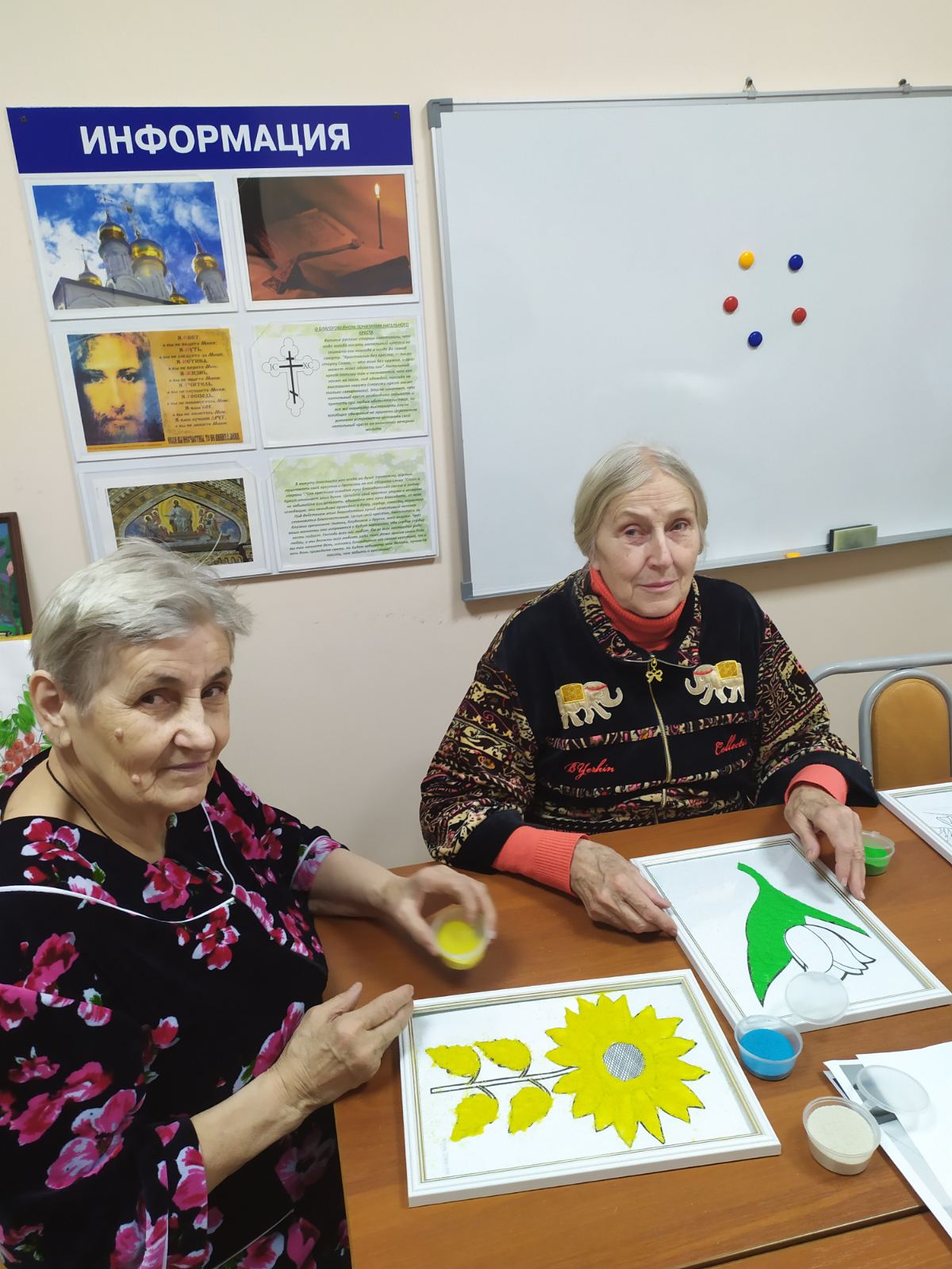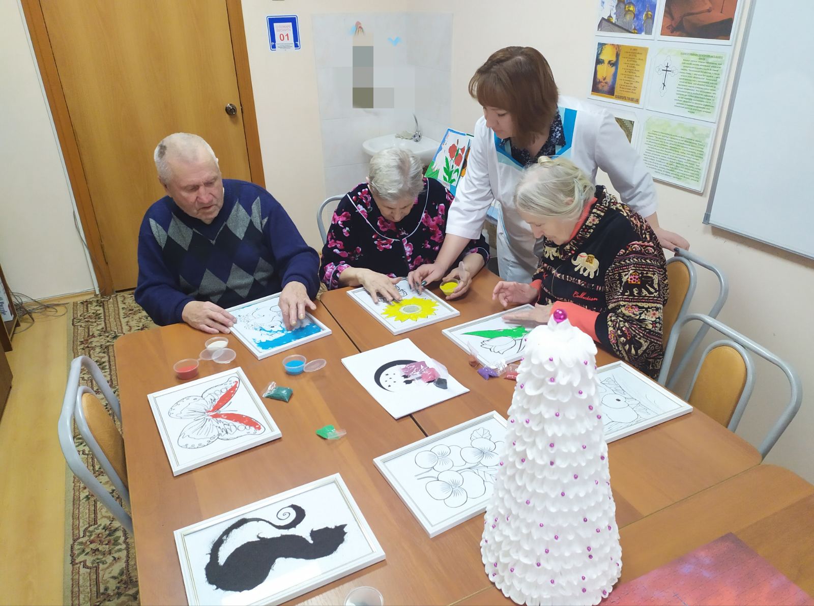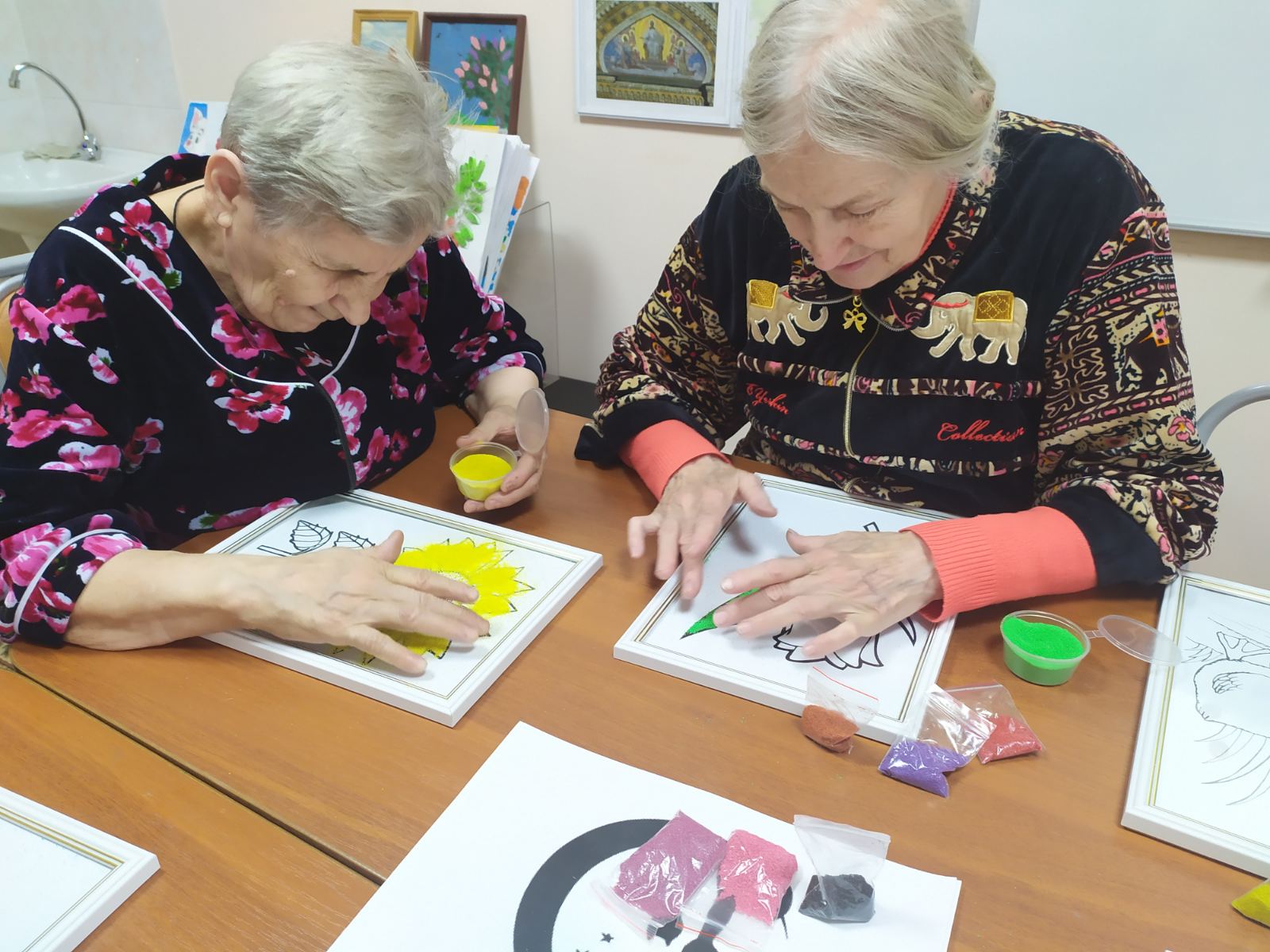 В песочной терапии используется уникальный материал – «Живой песок», он абсолютно безопасный и безвредный, произведен из нетоксичных материалов, приятный на ощупь. С помощью этого метода проходятся индивидуальные и групповые занятия. Например, сегодня пожилым людям предложили нарисовать «Картину из песка». Занятие способствовало улучшению эмоционального состояния и активизации когнитивных процессов. «Живой песок» успокаивает, расслабляет и снимает напряжение.